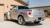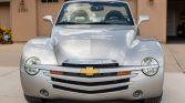 The SSR’s body sits on a modified GMT360 platform shared with the contemporary TrailBlazer, and styling was inspired by Chevrolet’s post-war Advance Design trucks. This example is finished in silver and features rear-fender SSR decals, a dual exhaust system with polished finishers, heated side mirrors, fog lights, and a body-color retractable hardtop that folds into a compartment between the cab and the truck bed. Paint chips on forward-facing surfaces are noted.