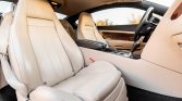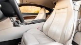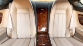 The interior is upholstered in cream-colored leather with wood trim along the door panels, dashboard, and front and rear center consoles. Amenities include heated and power-adjustable front seats with position memory, dual-zone climate control, a navigation system, a six-disc CD changer in the glove compartment, a centrally-mounted Breitling clock, and a rear seat center console.