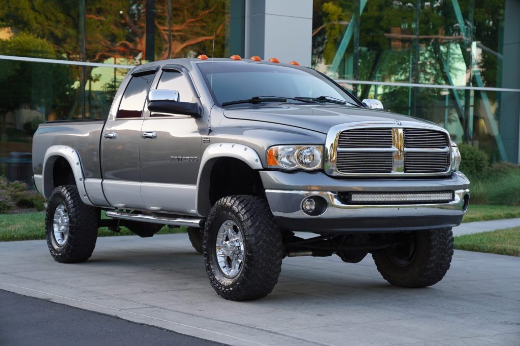 This 2005 Dodge Ram 2500 SLT 4×4 Hemi Sport is a quad cab pickup finished in Mineral Gray Metallic over Dark Slate Gray cloth upholstery and has 54k miles. The truck is powered by a 5.7-liter V8 linked with a five-speed automatic transmission and a dual-range transfer case and has been modified with a front light bar, aftermarket flared wheel arches, 17″ five-spoke Ultra Motorsports wheels, a Tuff Country lift kit, Bilstein dampers, a JVC head unit, a…