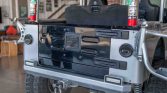 The truck is finished in black and silver and features a tubular roll cage with a bimini top and a solar panel. The front of the truck has been outfitted with Metalcloak tubular fenders and an aftermarket bumper with a Warn winch, while lighting is provided by a Rigid 50″ LED light bar, Maxxima bumper-mounted auxiliary lights, Vision X side lights, and a pair of LED auxiliary lights mounted to the rear bumper. Additional equipment includes protective body cladding, tubular side steps, metal half-doors, and a swing-out rear cargo rack with a powered ARB cooler as well as fire extinguishers and custom tow hooks.