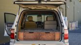 This 2005 Lexus LX470 is finished in Sand Dollar Pearl over Ivory leather and is powered by a 4.7-liter V8 paired with a five-speed automatic transmission, a dual-range transfer case, and a locking center differential. Equipment includes 18″ alloy wheels, a modified suspension with a 2.5″ lift, a Land Shark Outfitters drawer system in the rear cargo area, and power-adjustable and heated front seats.