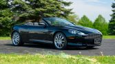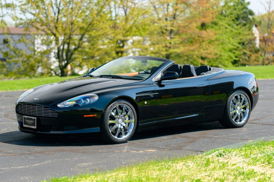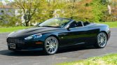 This 2006 Aston Martin DB9 Volante is finished in Jet Black over Obsidian Black leather and is powered by a 5.9-liter V12 linked with a six-speed automatic transaxle and a limited-slip differential. The car is equipped with chrome 19″ 10-spoke wheels, a replacement black soft top, heated power-adjustable front seats, and a Linn sound system.