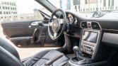 The cabin features black leather upholstery that extends from the heated and power-adjustable front seats to the dashboard, center console, and door panel inserts. Amenities include automatic climate control, a sport shifter, an Alpine touchscreen stereo with Apple CarPlay capability, Porsche-branded floor mats, and the Sport Chrono, Carbon, and Bose High-End Sound packages.