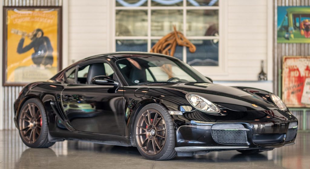 This 2006 Porsche Cayman S is powered by a 3.4-liter flat-six paired with a six-speed manual transaxle, and it has been modified with KW coilovers, 19″ and 20″ OZ Racing Ultraleggera wheels, and Pagid brake pads. Finished in Black over matching leather upholstery, the car is further equipped with a deployable rear spoiler, bi-xenon headlights, and fog lights in addition to aluminum-look trim, automatic climate control, a CD stereo, and cruise control.