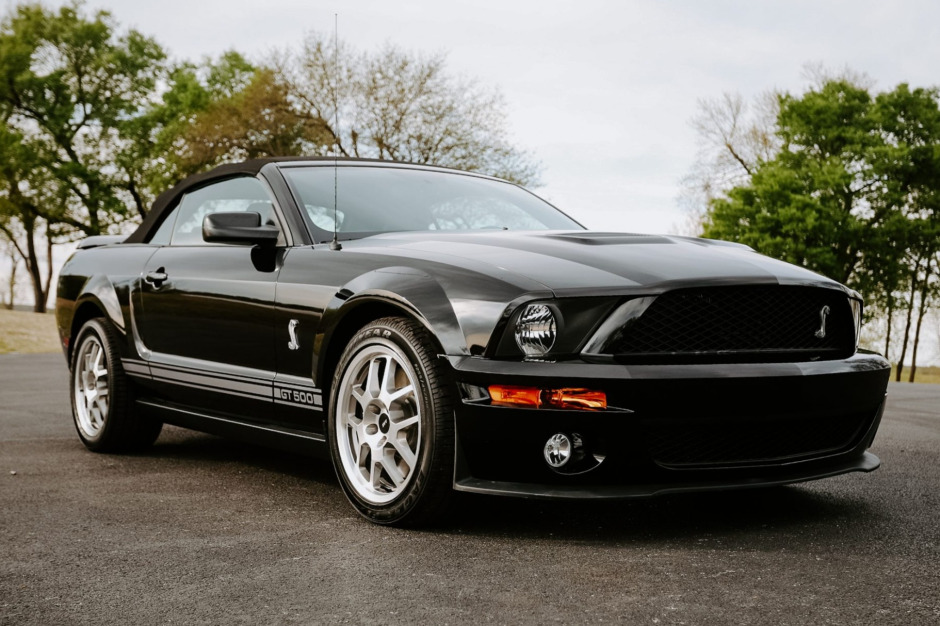 This 2007 Ford Mustang Shelby GT500 convertible shows 900 miles and is powered by a supercharged 5.4-liter V8 paired with a six-speed manual transmission. Finished in black over matching leather, it is equipped with a black soft top, air conditioning, 18″ SVT wheels, SVT-tuned suspension, front and rear spoilers, and a Shaker 1000 audio system.