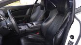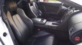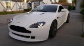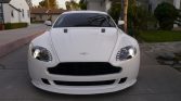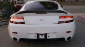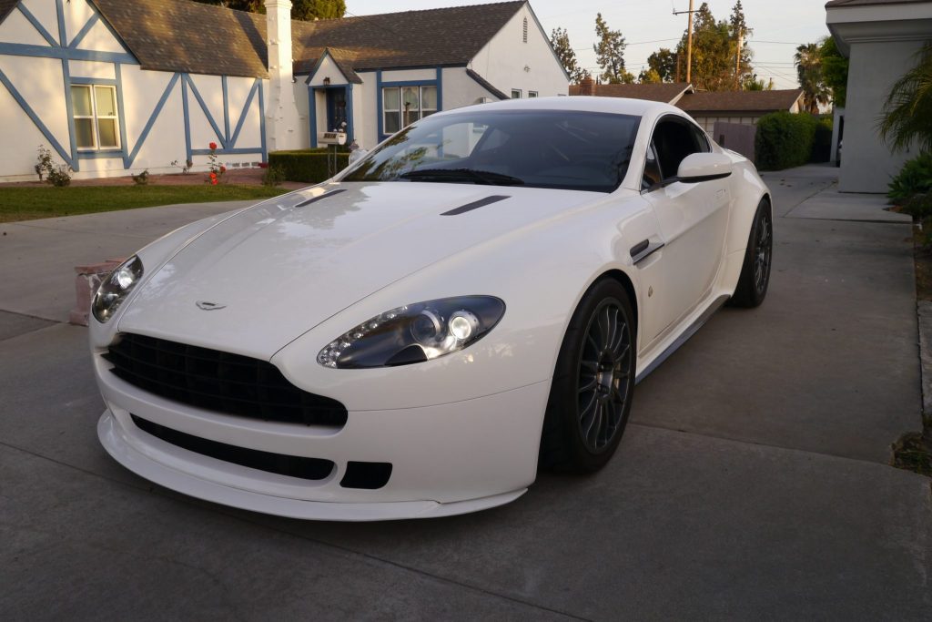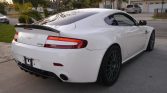 The car is finished in white and equipped with a V8 Vantage GT4-style carbon-fiber body kit that includes a front splitter, side skirts, a decklid spoiler, and a rear diffuser. Additional exterior features include HID headlamps with LED aLents, a black grille, and rear parking sensors.