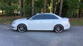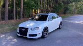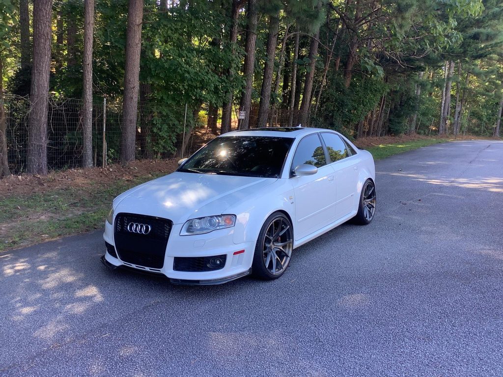 This 2008 Audi RS4 is finished in Ibis White over silver leather and powered by an APR supercharged 4.2-liter V8 paired with a six-speed manual transmission and a Quattro all-wheel-drive system. Additional equipment includes 20″ VS Forged wheels, an APR intercooler, an aftermarket ECU tune, KW coilovers, 034Motorsports control arms, an AWE Tuning exhaust system, heated power-adjustable seats, a flat-bottom steering wheel, and a JVC stereo. The car was first registered in Minnesota and was acquired by the seller in 2019. Recent service consisted of replacing the spark plugs and battery, along with performing a valve cleaning and an oil change.