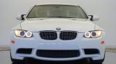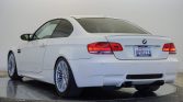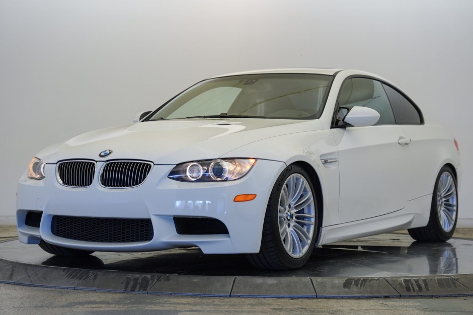 This 2008 BMW M3 is a white-over-black coupe that is powered by a 4.0-liter S65 V8 paired with a six-speed manual transmission and a limited-slip differential. Equipment includes power-adjustable and heated front seats, a glass sunroof, iDrive infotainment with navigation, Park Distance Control, adaptive xenon headlights with washers, Comfort Access, an aftermarket exhaust system, and lowered suspension with Electronic Damper Control.