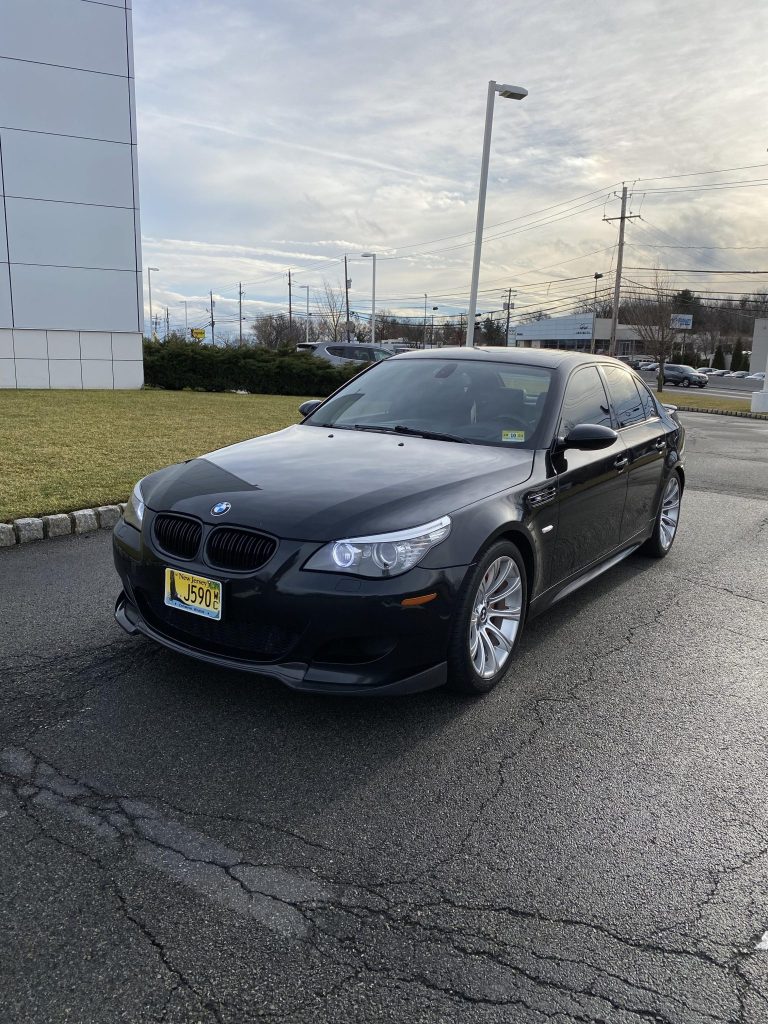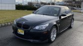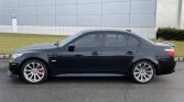 This 2008 BMW M5 is finished in black over matching leather and is powered by a 5.0-liter V10 paired with a six-speed manual transmission and an M Variable differential. Equipment includes 19″ wheels, adaptive xenon headlights, parking sensors, automatic climate control, a sunroof, navigation, a head-up display, power-adjustable heated front seats, and Comfort Access.