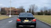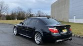 The M5 features revised bodywork compared to the standard 5 series, including unique bumper covers, side skirts, flared wheel arches, aerodynamic mirrors, and front fender vents. This example is finished in Black Sapphire Metallic and features adaptive xenon headlights with washers, Park Distance Control, Comfort Access, a sunroof, a rear decklid spoiler, and quad carbon-fiber exhaust tips.