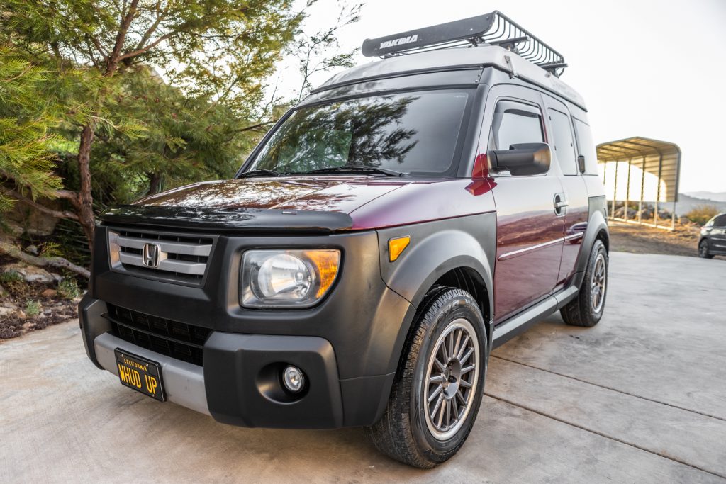 This 2008 Honda Element LX 4WD is finished in burgundy over gray cloth and equipped with a pop-up camper top, aftermarket dual–beam xenon headlights, a roof rack and basket, a ladder, a digital rear-view mirror, and a Kenwood touchscreen head unit with a back-up camera display. Additional features include 17″ Raceline wheels, air conditioning, reverse-hinged doors, a removable glass roof panel, tinted windows, sound deadening material, and a receiver hitch. Power is provided by a 2.4-liter inline-four paired with a five-speed automatic transaxle and a RealTime 4WD system.