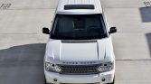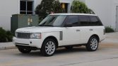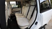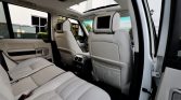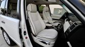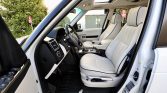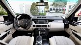 The cabin features seats upholstered in Ivory Oxford leather (TDC) with perforated seat inserts contrasted by a black dash and carpets protected by Range Rover-branded all-weather floor mats. Black woodgrain trim accents the steering wheel, dashboard, center console, and door panels. Additional equipment includes 14-way power-adjustable heated and ventilated front seats with memory, tri-zone automatic climate control, a rear-view camera, cruise control, navigation, Harman Kardon audio with a six-CD changer, Bluetooth connectivity, and satellite radio tuner. A rear-seat entertainment system that includes a six-DVD changer and two LCD screens mounted in the front headrests was added as a factory option.