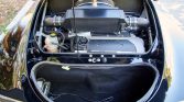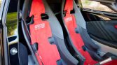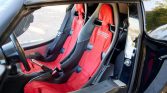 The seats are upholstered in black leather with red Alcantara inserts, and the exposed aluminum cockpit has a carbon-fiber upper dashboard panel, air conditioning, a four-speaker Alpine sound system, and tinted windows. A Greg’s Race Parts replacement carbon-fiber panel is installed on the right side.