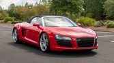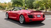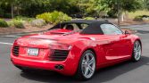This 2011 Audi R8 Spyder is powered by a 4.2-liter FSI V8 that drives all four wheels through a six-speed R-tronic automated transaxle and is finished in Brilliant Red over black leather. The car is equipped with a powered black convertible soft top, carbon Sigma interior trim, 19″ double-spoke wheels, a speed-activated rear spoiler, xenon headlights, a rearview camera, a Bang and Olufsen sound system, heated power-adjustable seats, and Audi Navigation Plus.