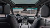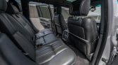 The cabin features seating surfaces upholstered in Jet black leather with a matching dash, door panels, and carpets. Amenities include heated and ventilated power-adjustable front seats, heated and reclining rear seats, tri-zone automatic climate control, a power tilt-and-telescopic steering column, a Harman Kardon audio system, keyless entry with a push-button start, rear headrest display entertainment systems, and a color touch screen navigation system with Bluetooth connectivity and a USB port.
