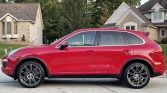 This 2013 Porsche Cayenne is finished in Carmine Red over black leather and is powered by a 3.6-liter V6 driving all four wheels through a six-speed manual transmission. Equipment includes 21″ wheels, parking sensors, stainless steel skid plates, power-adjustable front seats, a heated carbon fiber-trimmed steering wheel, cruise control, dual-zone automatic climate control, and a 10-speaker audio system.