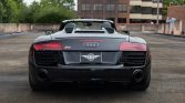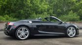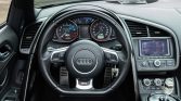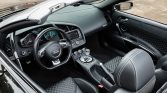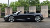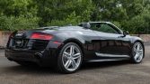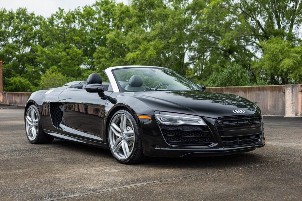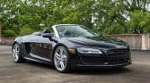 This 2014 Audi R8 Spyder is powered by a 5.2-liter FSI V10 that drives all four wheels through a six-speed manual transaxle and is finished in Phantom Black Pearl Effect over black Fine Nappa leather with diamond stitching. Servicing involved replacing the clutch, flywheel, slave cylinder, and battery. Equipment includes a black convertible soft top, 19″ double-spoke wheels, a speed-activated rear spoiler, LED headlights, parking sensors, a rearview camera, a Bang & Olufsen sound system, and heated power-adjustable seats.