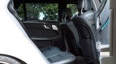 The cabin features seats upholstered in black Nappa leather (821) with contrasting silver stitching, matching door panel inserts, silver seat belts, and carbon fiber trim on the dashboard and doors. The heated and ventilated front seats feature dynamic bolsters, and additional amenities include heated rear seats, Keyless-GO, powered rear window shades, COMAND infotainment with navigation, and a Bang & Olufsen sound system. Driving aids include Parktronic with Active Parking Assist, a surround-view camera, Distronic Plus cruise control, active blind spot and lane keeping assist, and cross-traffic assist.