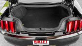The restyled nose of the GT350 is approximately 1.4″ wider than that of the standard Mustang and features a lower hood line and headlights. This example is finished in Shadow Black, and aerodynamic aids include a Shelby-branded front splitter, a vented hood, a carbon-fiber rear wing, front fender vents, and aerodynamic side skirts.