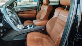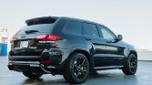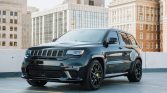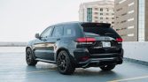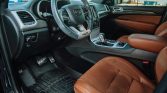 The black satin-finished 20″ aluminum wheels are mounted with Pirelli Scorpion Verde All Season tires measuring 295/45 all around. The Trackhawk rides on a Bilstein competition suspension with adaptive damping and is equipped with a Selec-Trac system with launch control and five drive modes. An Eibach anti-roll kit and lowering springs are installed. Stopping power is provided by yellow-finished six-piston front and four-piston rear Brembo brake calipers.