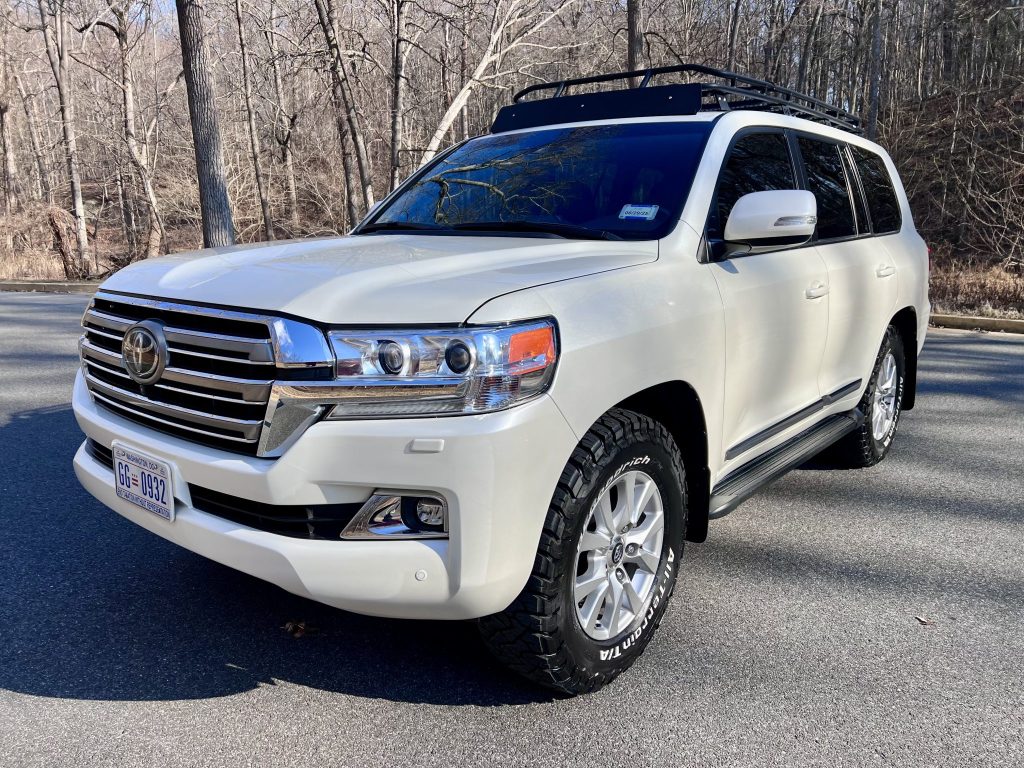 This 2018 Toyota Land Cruiser is provided by a 5.7-liter V8 linked with an eight-speed automatic transmission, a dual-range transfer case, and a Torsen locking center differential. A Gobi roof rack and ladder have been installed, and additional features include 18″ alloy wheels, Crawl Control, a Multi-Terrain Monitor system, a sunroof, heated and ventilated front seats, heated second-row seating, Dynamic Radar cruise control, touchscreen navigation, JBL audio, and four-zone automatic climate control.