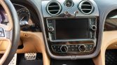 The seating surfaces are trimmed in Camel leather with contrasting stitching. The Front Seat Comfort Specification consists of 22-way power-adjustable front seats with heat, ventilation, and massaging functions as well as position memory, front comfort headrests, and electric height adjustment for the front seatbelts. Mulliner Driving Specification added diamond-quilted seat and door panel inserts, drilled alloy pedals, and embroidered Bentley emblems on the seat backs. The cabin also features multi-zone automatic climate control, a 10-speaker sound system, a quilted rear bumper guard in the rear cargo area, all-weather floor mats, a veneer-finished center fascia panel, and an infotainment system with an 8″ touchscreen, navigation, and Bluetooth connectivity.