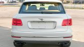 The exterior is finished in optional Ghost White Pearlescent, and Centenary Specification details include Bentley emblems with Centenary Gold-color accents as well as unique welcome lights and door sill plates. Additional equipment consists of LED headlights, a panoramic sunroof, chrome mesh grilles, roof rails, a rear spoiler, and Twin-Quad exhaust outlets.