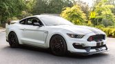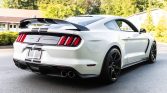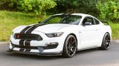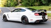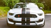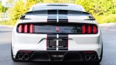 The car is finished in Oxford White with optional over-the-top black and red vinyl racing stripes and features HID projector headlights, functional hood and fender vents, a front splitter with the Shelby logo, a carbon-fiber wing, LED taillights with sequential turn signals, and quad exhaust outlets.