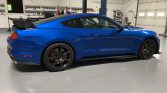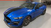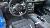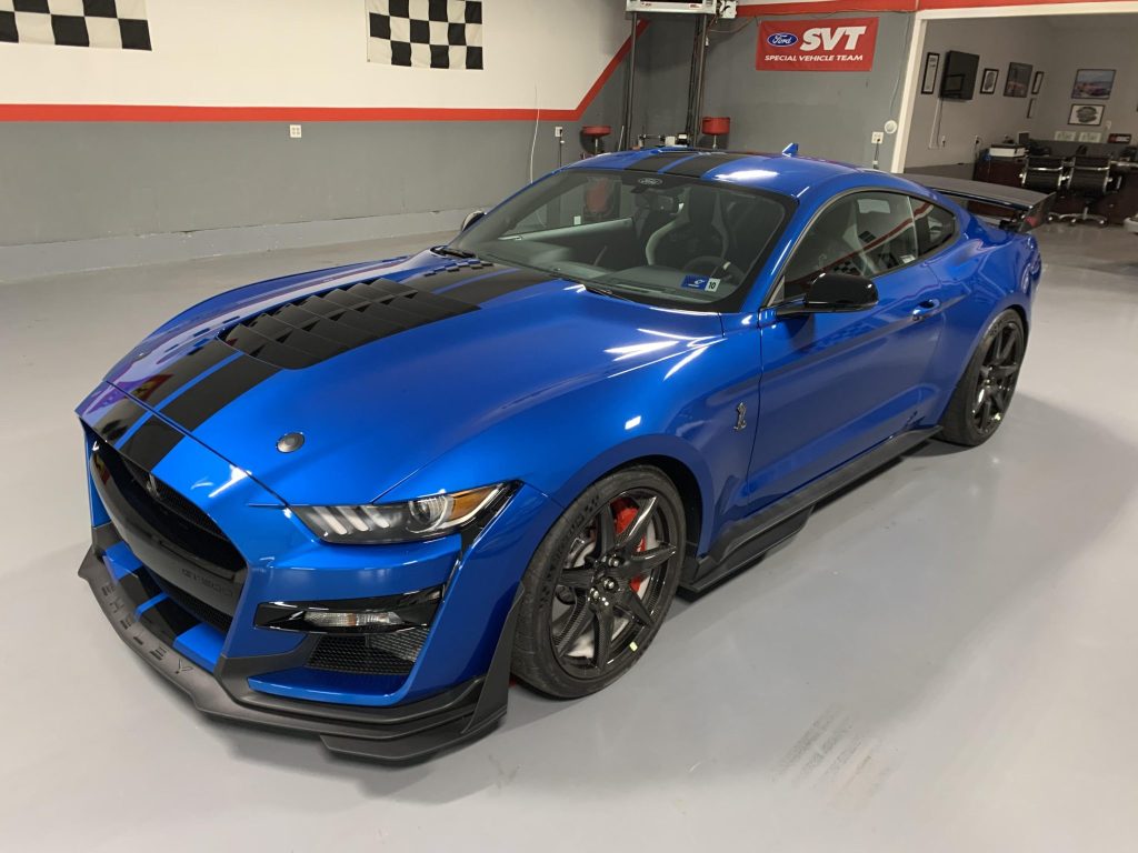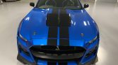 This 2021 Ford Mustang Shelby GT500 is finished in Velocity Blue Metallic with Ebony vinyl stripes over Ebony leather and Miko suede with Dove accents. Features include the Carbon Fiber Track Pack, the Technology Package, HID headlights, carbon-fiber 20″ seven-spoke wheels, Brembo brakes, Recaro front seats, and a Bang & Olufsen 12-speaker audio system. Power is provided by a supercharged 5.2-liter V8 linked with a Tremec seven-speed dual-clutch automatic transmission and a Torsen limited-slip differential.