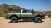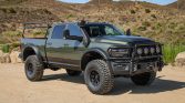 This 2022 Ram 2500 Power Wagon has been fitted with the American Expedition Vehicles (AEV) Prospector XL package, and it is powered by a 6.4-liter Hemi V8 linked with an eight-speed automatic transmission, a dual-range transfer case, and Tru-Lok front and rear differentials with revised gearing. The truck is finished in Olive Green Pearl-Coat and has a lifted suspension, Bilstein shocks, 17″ wheels, and 40″ tires along with heavy-duty bumpers, high-clearance fender flares, an air intake snorkel, a front…